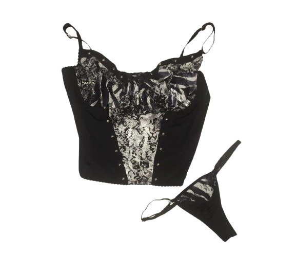 Transformá tu look con este corset de lycra que combina un atrevido estampado Animal Print y una tanga less que dejará a todos sin aliento. Ideal para esas noches especiales o para sentirte única en cualquier ocasión.