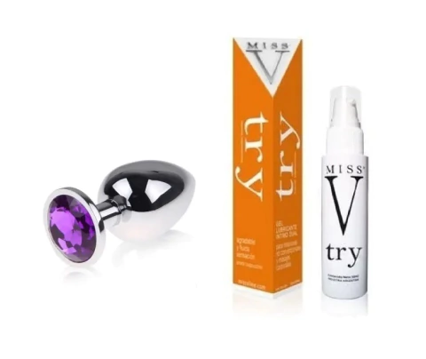 Contiene un delicado plug de acero con terminación en diamante de colores y viene con un Lubricante Intimo Anal Miss V Try